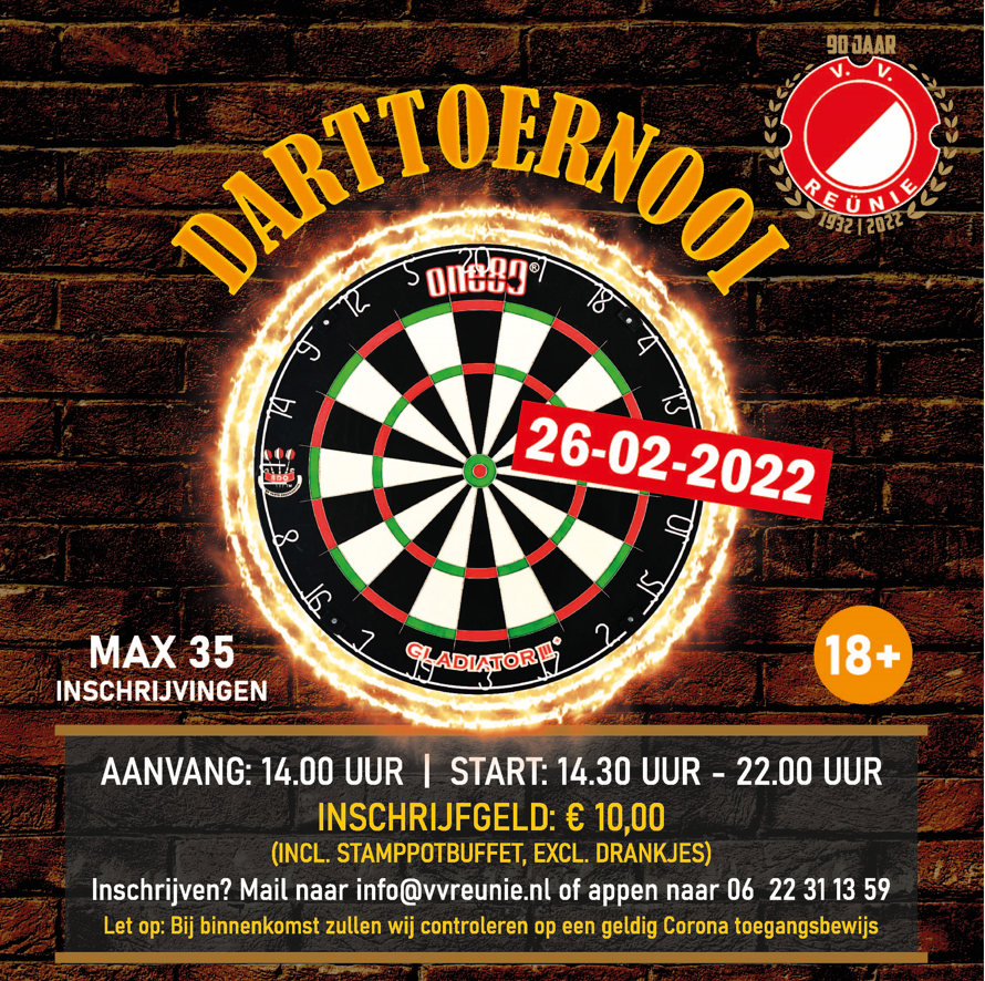 Op zaterdag 26 februari organiseert v.v. Reünie een darttoernooi voor de leden en vrijwilligers (18+). De kosten zijn 10,- (incl. een stamppot buffet, excl. drankjes). Je kunt je inschrijven door een mail te sturen naar: info@vvreunie.nl of een appje naar 06 22 31 13 59 (Bram Reijntjes). Let op: wij gaan deze avond controleren opContinue reading "Darttoernooi"